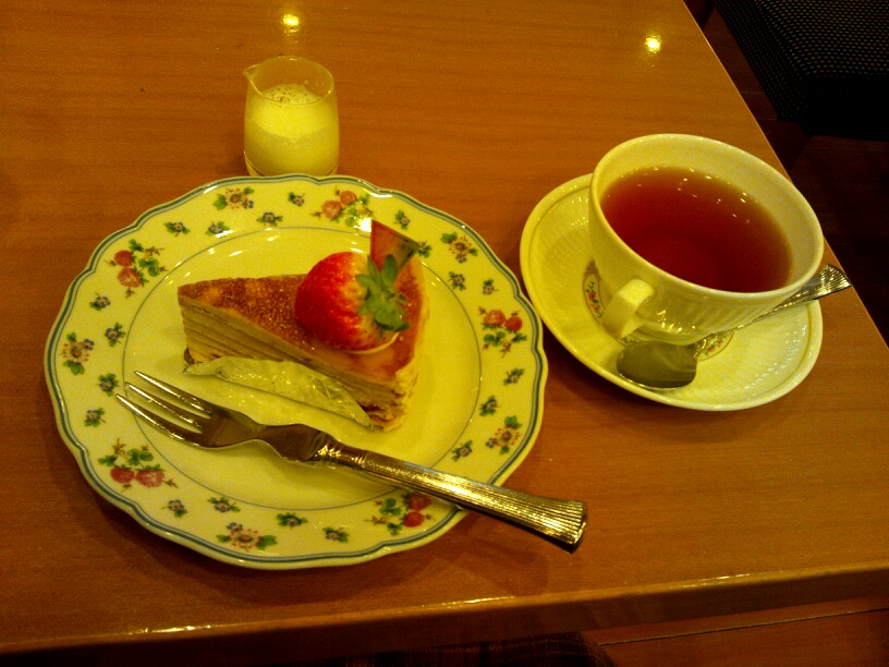 イチゴのミルフィーユと、オリジナルブレンドティー。ミルフィーユはおもったよりあっさりで、ほんのりイチゴな香り。オリジナルブレンドティーは、ミルクティー用にちょっと濃い目な感じで、目の前で注いでくれます。嬉しいのはミルクが温かいこと!牛乳です!ポーションも悪くないけど、私は牛乳派!
